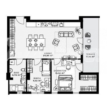 Apartamentul are o suprafață utilă de 66,79 mp și dispune de o terasă spațioasă de 11,14 mp. Compartimentarea este practică și modernă, fiind compusă din living cu bucătărie open-space, două dormitoare, baie și terasă. Se vinde în stadiu semifinisat, oferind posibilitatea de amenajare după preferințele viitorului proprietar.
