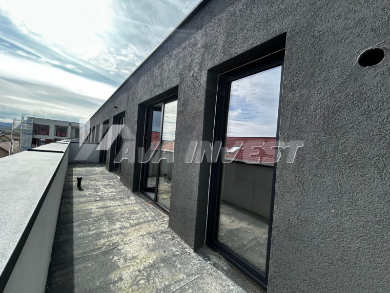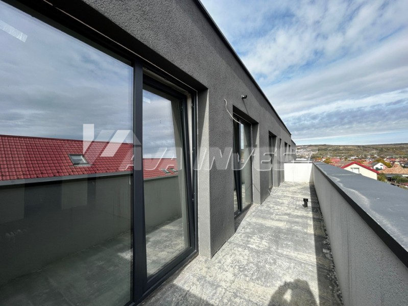 Vă propunem spre vânzare un apartament modern cu 3 camere, situat la etajul 3 retras al unui imobil nou (2S+P+2E+Etaj retras). Suprafața utilă este de 72,46 mp, la care se adaugă o terasă de 17,17 mp, accesibilă din fiecare cameră.