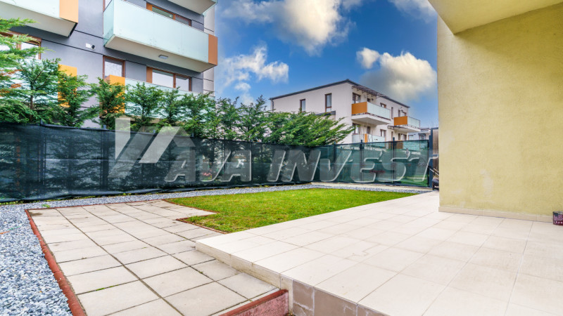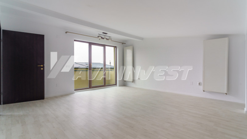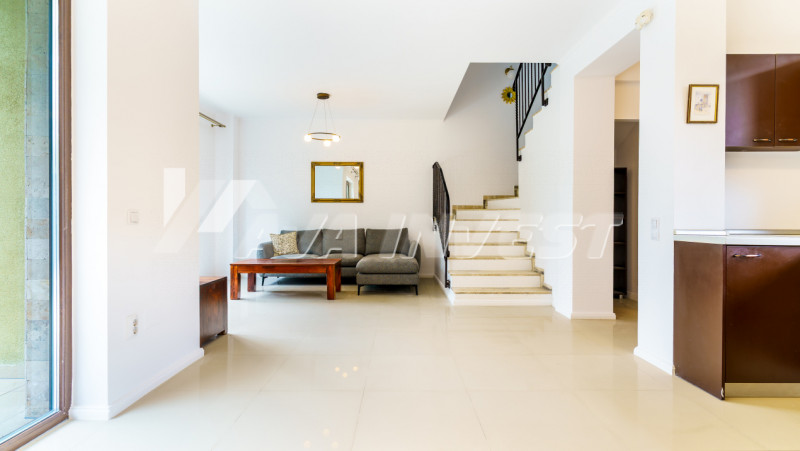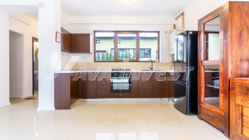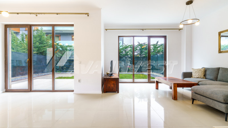 Parter: hol, baie, living spațios cu bucătărie deschisă și zonă de dining, cu acces direct pe terasă.